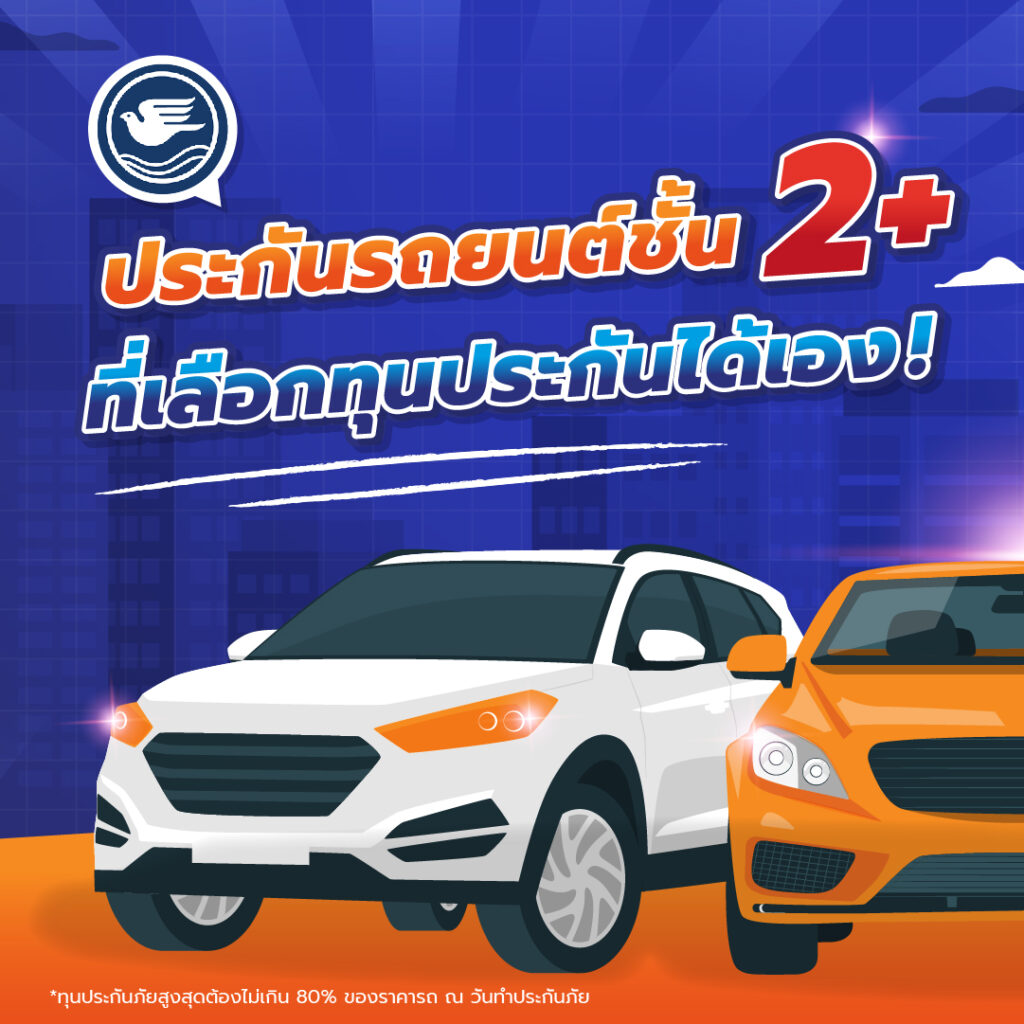 • ประกัน 2 พลัส (2+) คุ้มครอง รถชน รถหาย ไฟไหม้ (กรณีชน ต้องมีคู่กรณีเป็นยานพาหนะทางบก จึงสามารถเคลมได้)
