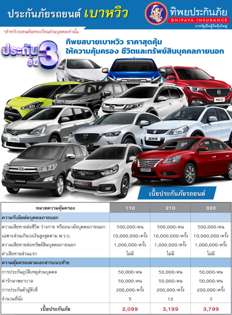 - รถอายุเยอะไม่ต้องห่วง ซื้อประกันชั้น 3 ทิพยเบาหวิว รับความคุ้มครองทันที ซื้อออนไลน์ได้ตลอด 24 ชม. สบายใจ สบายกระเป๋า เพียง 2,100 บาท ให้ความคุ้มครองความเสียหายที่เกิดขึ้นกับฝ่ายคู่กรณี คือ ความเสียหายต่อชีวิต ค่ารักษาพยาบาล และทรัพย์สิน