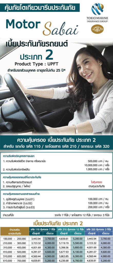 - สำหรับรถยนต์ส่วนบุคคล รหัส 110 (7ที่นั่ง), 210 (12 นั่ง), 320 (3 ที่นั่ง) อายุรถยนต์ไม่เกิน 25 ปี บริษัท คุ้มภัยโตเกียวมารีนฯ ด้วยแผนประกัน Motor Sabai ทุกรุ่น ทุกยี่ห้อ จัดมา ลดพิเศษ ส่งฟรี คุ้มจัด ซื้อเลย! จัดส่งฟรี ทั่วไทย สั่งซื้อออนไลน์ ตลอด 24 ชม. แจ้งปุ๊บ คุ้มครองปั๊บ